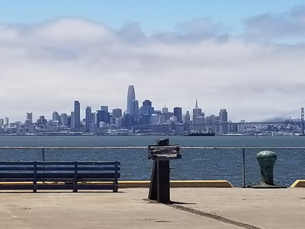 The Hornet is famous for a couple of reasons. In 1942 the Navy loaded it up with B-25's and it sailed across the Pacific and launched the first attack on Tokyo after Pearl Harbour, the "Jimmy Doolittle Raid". Also, in 1969, it was the recovery craft for the Apollo 11 astronauts when they splashed down after returning from the moon. Video from the time will show Richard Nixon greeting them on the deck of the Hornet. Pretty cool. From the pier, the view of San Francisco across the bay: